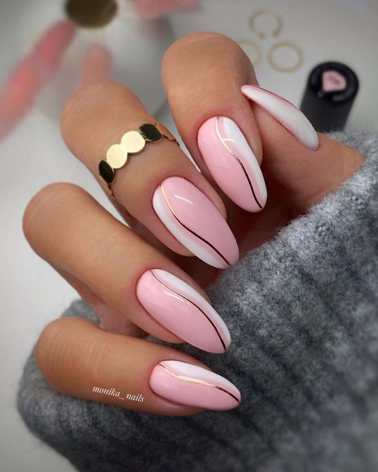 Маникюр с розовыми ногтями, дизайном в виде тонких линий и украшением в виде кольца.