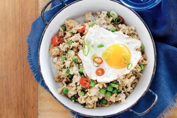 Индонезийский жареный рис Ингредиенты: жасминовый рис - 1,5 чашки масло кедровых орехов - 1,5 ст. л. зеленый лук - 4 стебля зеленый горошек - 1 чашка соевый соус - 2 ст. л. перец чили - 2 шт. яйца - 4 шт. Приготовление: 1. Отварите рис, следуя инструкции на...