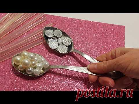 Изображение с двумя ложками: в одной находятся жемчужины, а в другой — монеты, на фоне блестящего розового материала.