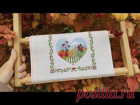 На изображении вышивка на ткани, которая находится на деревянной раме. В центре вышивки изображено сердце с домом, деревьями и забором на фоне осеннего пейзажа. Вокруг вышивки декоративная рамка из цветочных узоров. На заднем плане видны осенние листья.