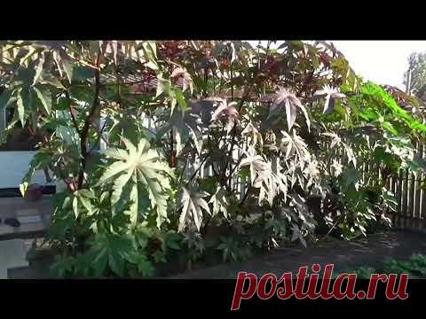 На изображении виден кустарник с большими листями, вероятно, рицинус, растущий на улице.