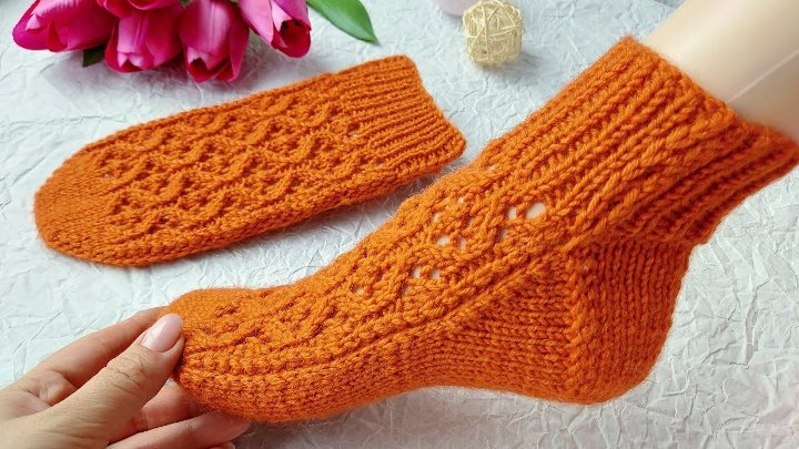 Изображение оранжевых вязаных носков с ажурным узором. Один носок надет на ногу, а второй лежит рядом. На заднем плане также видны цветы и небольшой декоративный шарик.