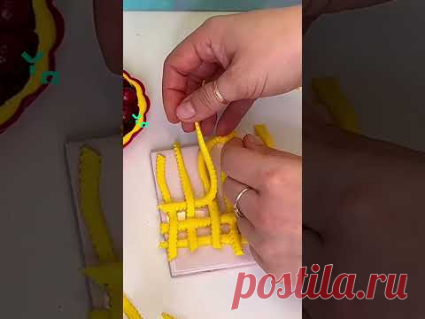 Человек плетет узор из желтых полосок на белой основе. В левом верхнем углу видна часть украшения в форме цветка с ягодами.