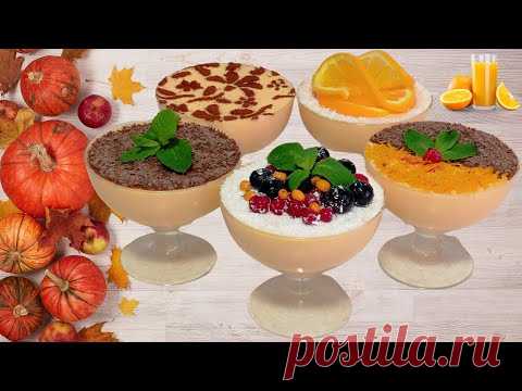 Изображение нескольких десертов в креманках, украшенных фруктами и шоколадом. Слева гарнир из тыкв и осенних листьев.