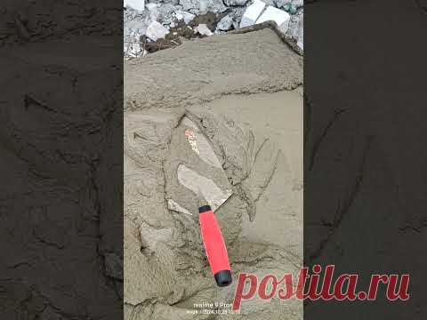 На изображении крупный план строительного раствора, на который положен мастерок с красной ручкой.