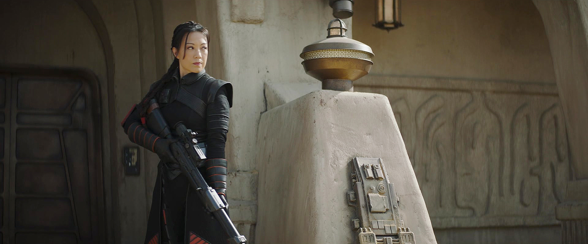 На изображении показана женщина с винтовкой, стоящая около здания в футуристическом стиле.