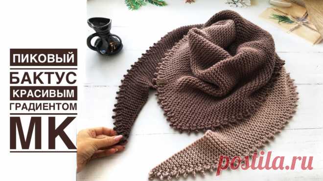 На изображении показан коричневый вязаный бактус с градиентом, расположенный на светлом столе. Рядом находится черная чашка с напитком, еловые веточки и подарочная упаковка. На изображении также присутствует текст на русском языке о бактусе и мастер-классе.