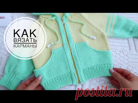 На изображении детская вязаная кофта в пастельных тонах, расположенная на вязаном полотне. Кофта имеет карманы и капюшон. В левом верхнем углу текст "Как вязать карманы".