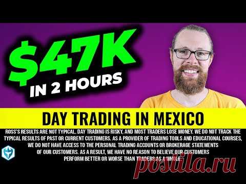 На изображении текст с крупной надписью «$47K за 2 часа» и подзаголовком «Дневная торговля в Мексике». Содержится предупреждение о рисках дневной торговли. Справа изображен бородатый человек в очках.