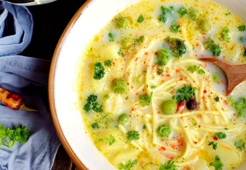 На изображении тарелка с супом, содержащим вермишель, зелёный горошек и зелень, с деревянной ложкой.