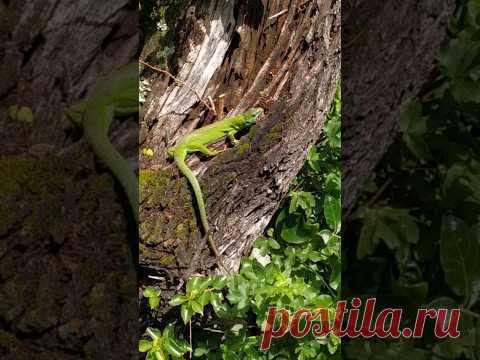 Изображение зеленой ящерицы на стволе дерева, окружённой листвой.