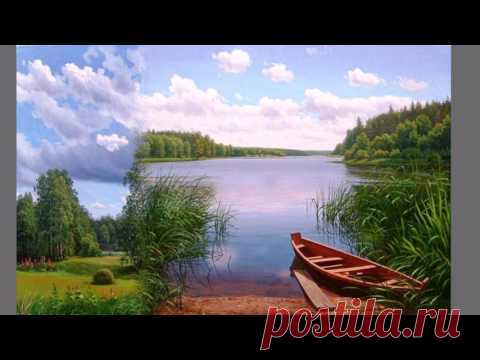 Изображение пейзажа с озером, окружённым густой растительностью, и деревянной лодкой на переднем плане.