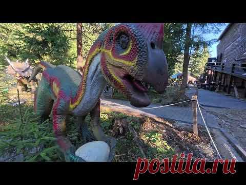 Фигура динозавра на улице в лесистой местности, держащая яйцо. Рядом видны другие фигуры и небольшая дорожка.