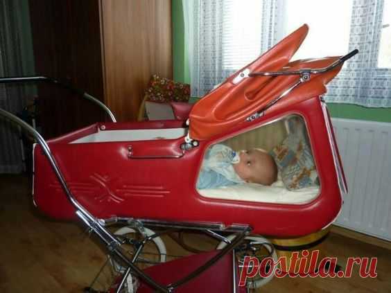 На изображении находится маленький ребёнок в красной коляске. Коляска стоит в помещении около окна.