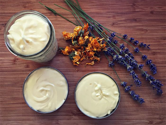 Изображение показывает три контейнера с кремом на деревенском фоне, рядом с которым лежат сушёные цветы и лаванда.