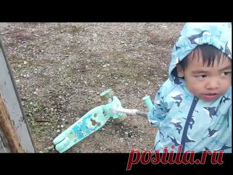 На изображении ребенок в голубом дождевике стоит на улице возле ржавого самоката на земле.