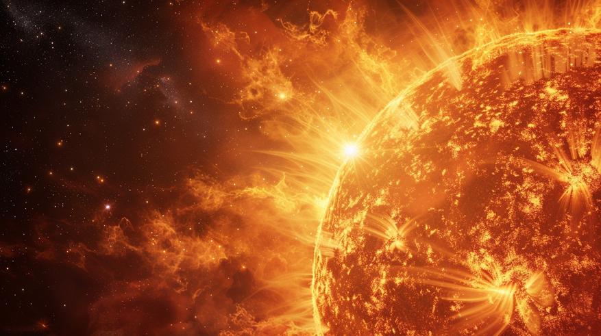 Изображение солнечной поверхности с яркими вспышками и излучением в космосе.