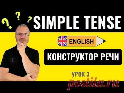 Изображение рекламы урока английского языка с надписью "Simple Tense", "Конструктор речи", "Урок 3" и изображением мужчины на жёлтом фоне.