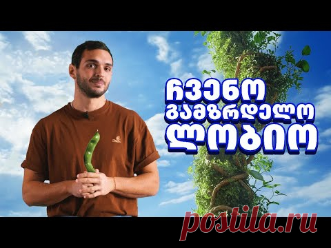 Изображение мужчины, держащего стручок фасоли на фоне неба и большого растения. На изображении есть текст на грузинском языке.