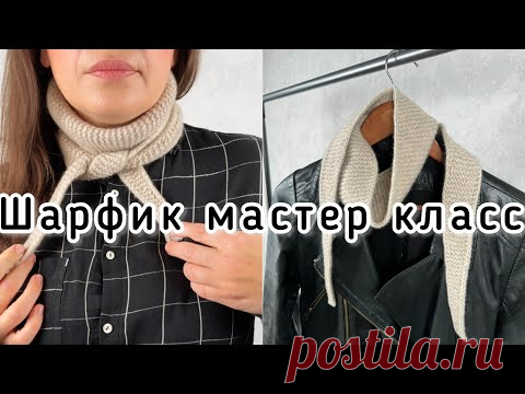 Изображение показывает мастер-класс по завязыванию шарфа. На левой стороне женщина демонстрирует, как завязать шарф на шее. На правой стороне шарф висит на куртке на вешалке.