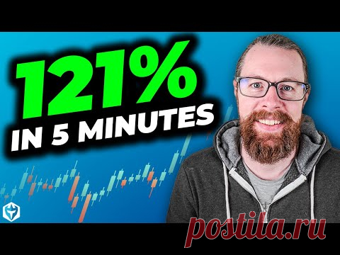 Изображение показывает мужчину в очках и толстовке на фоне графика и текста "121% за 5 минут".