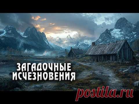 Изображение с пейзажем в горах на закате, на переднем плане деревянные дома. Текст гласит: "Загадочные исчезновения".