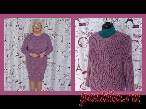 На изображении женщина в вязаном платье и манекен с аналогичным изделием. Обе одежды выполнены в лиловом цвете. На заднем плане присутствует узор с элементами Парижа.