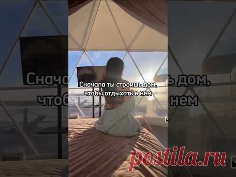 На изображении человек сидит в геодезическом доме и смотрит в окно на солнечный пейзаж. На переднем плане видна надпись на русском языке.