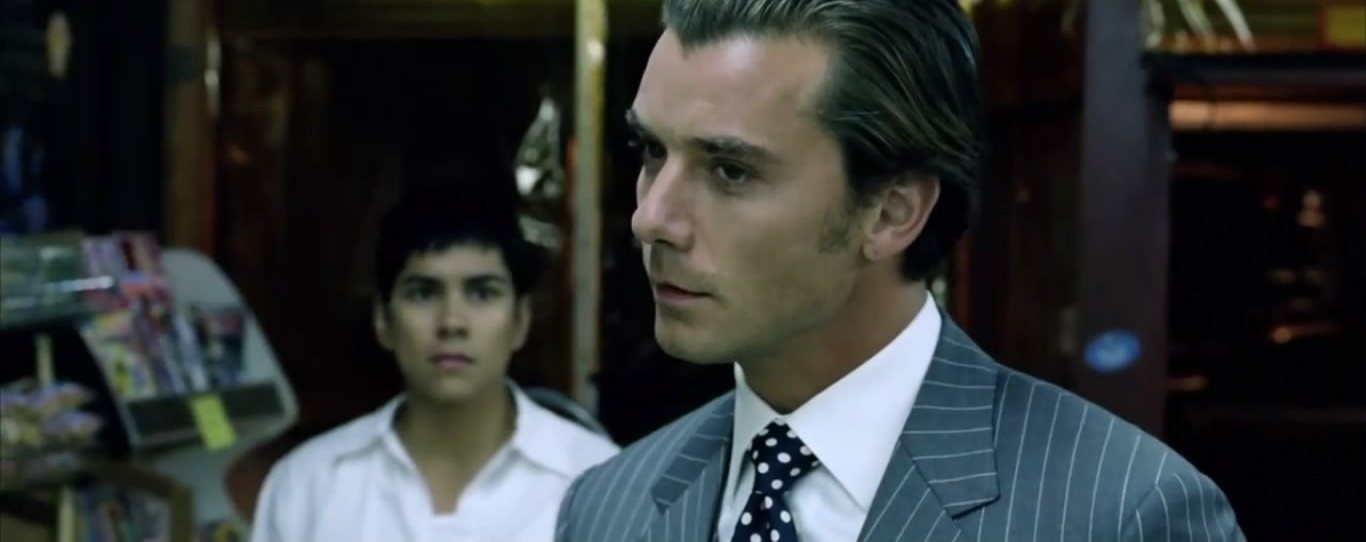 На изображении два человека находятся в помещении, один в деловом костюме, другой в белой рубашке. Они смотрят в сторону. В помещении расположены полки с товарами.