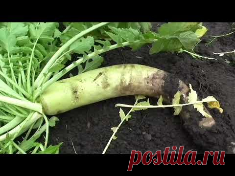 На изображении показан крупный вырванный корнеплод дайкон с зелеными листьями на тёмной почве.