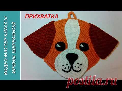 Вязаная прихватка в форме головы собаки с ушками и глазами. В левом углу текст с упоминанием мастер-класса Ирины Шерекиной.