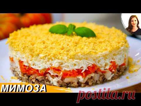 На изображении изображён салат "Мимоза", состоящий из слоёв рыбы, яиц, моркови и картофеля. Верх украшен тёртыми желтками и зеленью.