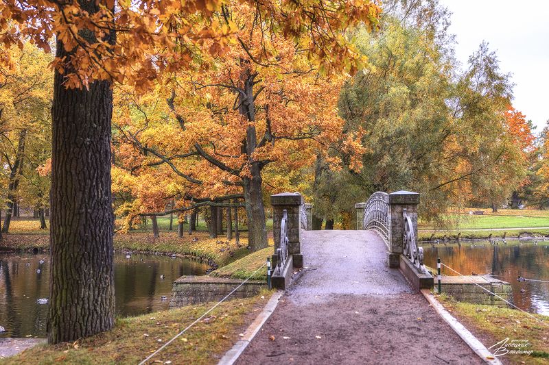 На изображении показан осенний пейзаж с мостом через реку, окруженный деревьями с разноцветной листвой.