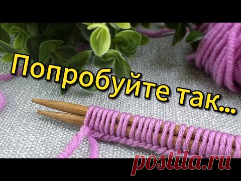 Изображение показывает вязальные спицы с розовой пряжей и текстом "Попробуйте так...". На заднем плане видна зелень.