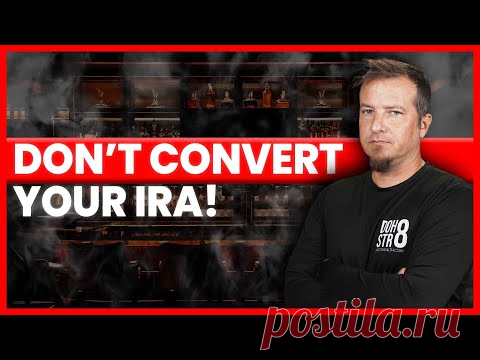 Изображение с человеком на правой стороне и текстом "DON"T CONVERT YOUR IRA!" на фоне с темным интерьером.