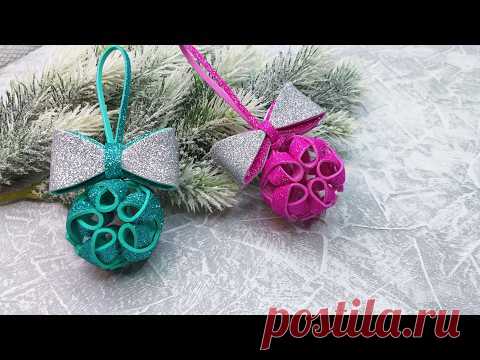 На изображении два рождественских украшения из фоамирана в форме шаров с серебристыми бантами на ветке хвои. Одно украшение бирюзового цвета, другое розового.