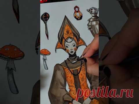 На изображении показан процесс рисования персонажа в традиционной русской одежде. Человек добавляет детали к рисунку с помощью кисти. На рисунке также присутствуют элементы, такие как сказочный гриб и декоративные украшения.