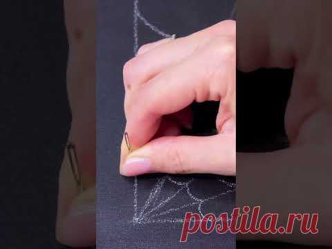 Изображение руки, использующей специальное приспособление для вышивки на черной ткани с нанесенным рисунком.