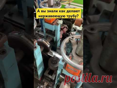 На изображении показан процесс изготовления нержавеющей трубы на заводе. Можно увидеть оборудование и часть трубопровода.