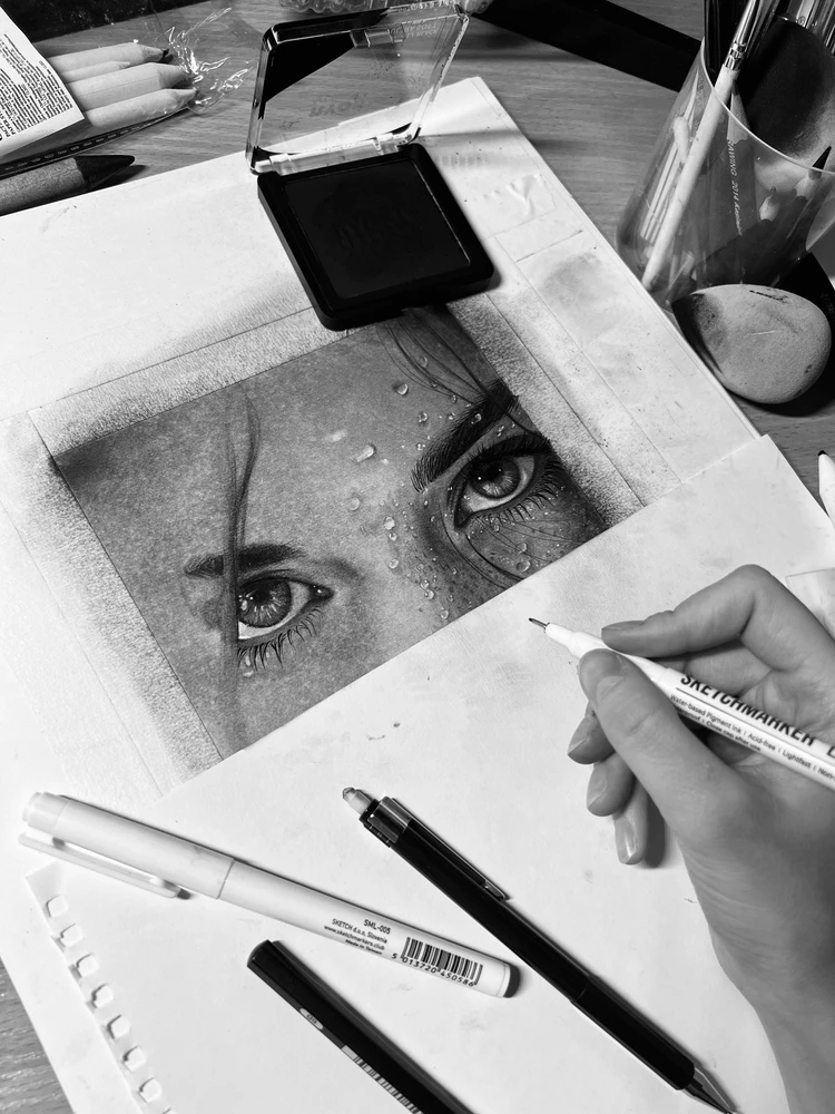 На изображении рука художника рисует реалистичный портрет с изображением глаз на листе бумаги. Вокруг листа находятся различные художественные принадлежности, такие как маркеры и карандаши.
