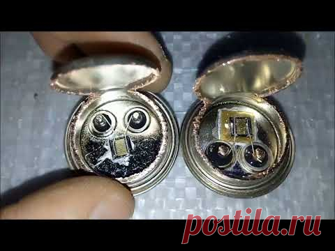Изображение показывает открытые внутренности двух круглых металлических предметов, предположительно батареек или электронных устройств, с видимыми контактами и элементами внутри.