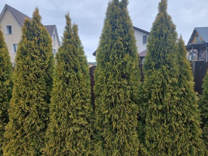 На изображении видны ряды туй на фоне частных домов. Туи густо растут и закрывают вид на забор.