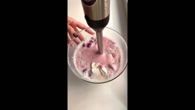 На изображении показан процесс приготовления фруктового коктейля с помощью погружного блендера. В чаше находятся ягоды и йогурт, которые смешиваются для получения напитка.