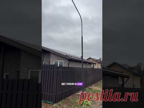 Изображение загородного дома с тёмной крышей и забором. На переднем плане фонарный столб на фоне пасмурного неба.