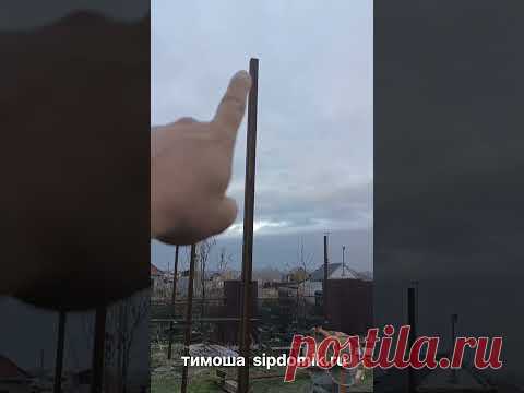 На изображении рука указывает на вертикально стоящий металлический столб на улице. На заднем плане видны облака и несколько строений.