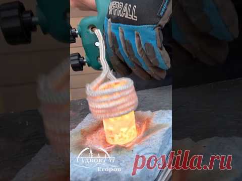 Изображение демонстрирует процесс плавки металла с помощью индукционного нагревателя. Человек в защитных перчатках держит катушку, внутри которой находится расплавленный металл.