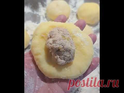 Изображение показывает процесс приготовления блюд. Видна рука, держащая тесто с начинкой, вероятно, с мясом. На заднем плане есть несколько заготовок из теста.