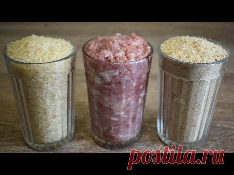 На изображении три стакана, наполненные рисом, мясным фаршем и панировочными сухарями.