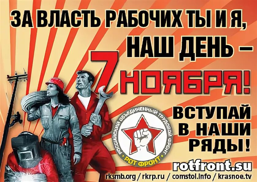 Плакат с изображением рабочих с лозунгом за революцию, содержащий дату 7 ноября и призыв вступать в ряды.