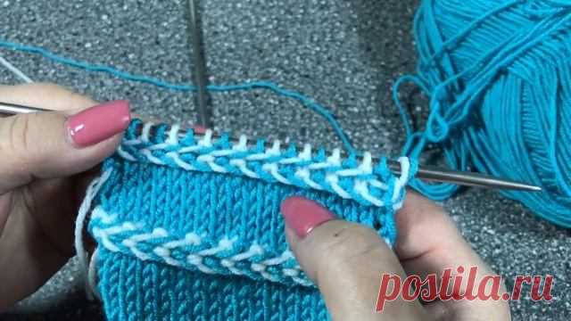 Двухцветная отделочная косичка. Отделка вязаных изделий спицами. Двухцветная отделочная косичка или обручок применяют при вязании варежек, носочков,как отделка по низу изделий, на карманах или манжетах. Можно использовать при вязании поворотными рядами и по кругу.